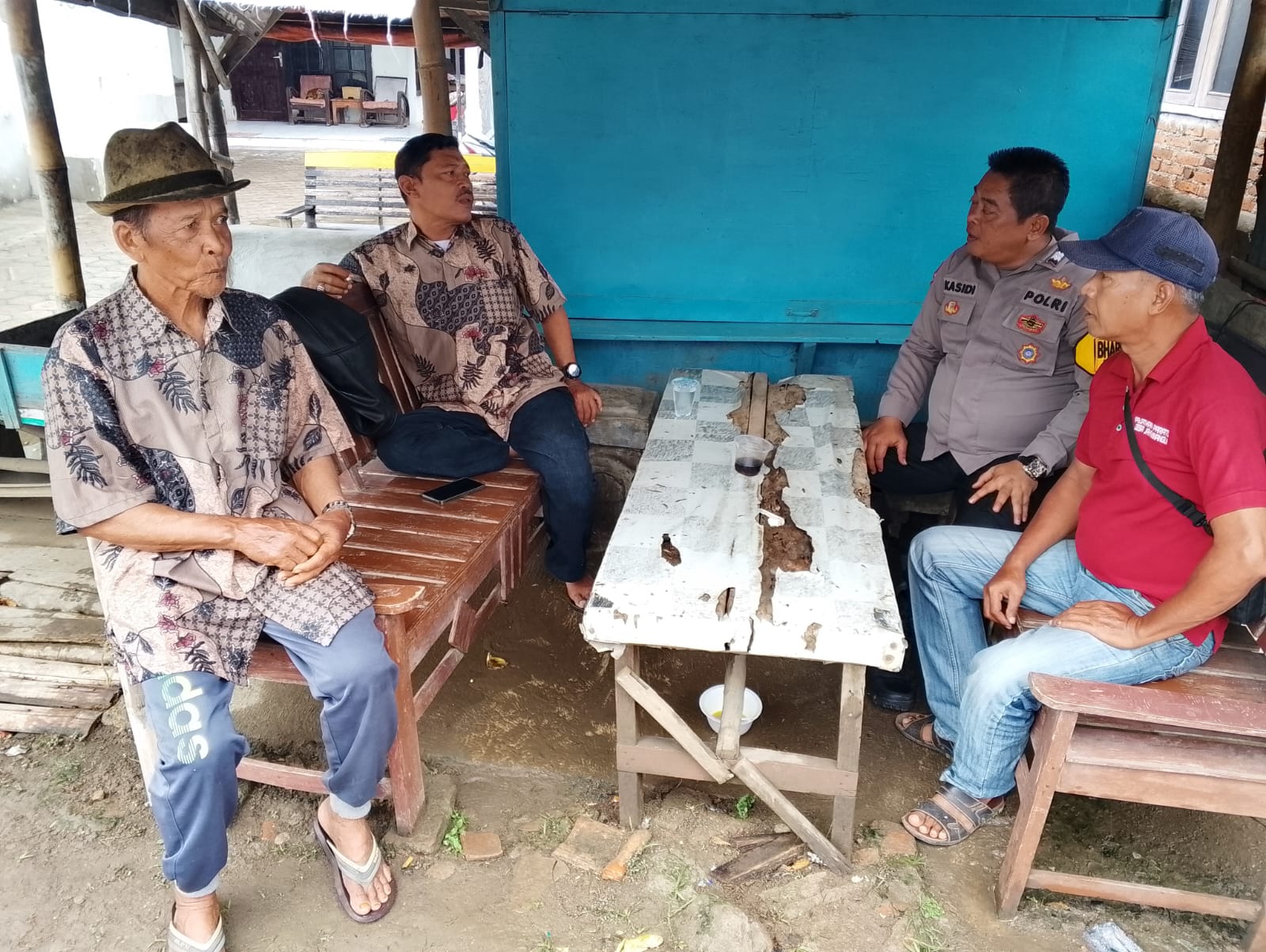 Indramayu – Di tengah hujan gerimis, Aiptu Kasidi, Bhabinkamtibmas Desa Cangkingan, Polsek Kedokanbunder Polres Indramayu Polda Jabar tampak duduk bersama di sebuah saung kecil berbincang dengan warga, Selasa (19/8/2025) pukul 10.45 WIB.