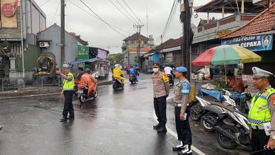 Kapolres Badung AKBP Teguh Priyo Wasono, SIK didampingi Kabag Ops Kompol I Gede Made Surya Atmaja. P, S.Sos, MH dan beberapa personil mengatur lalu lintas ditengah turunnya hujan di jalan Raya Kapal (simpang Cempaka), Kelurahan Kapal, Kecamatan Mengwi, Kabupaten Badung, Bali. Sabtu, (8/7) siang.