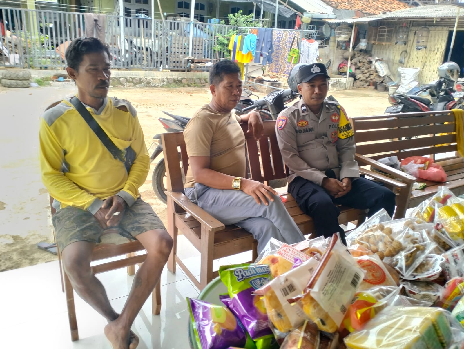 Dalam suasana santai di teras rumah warga yang sekaligus menjadi lokasi usaha kecil makanan ringan, AIPDA Rojani tampak duduk berdampingan dengan dua warga setempat.