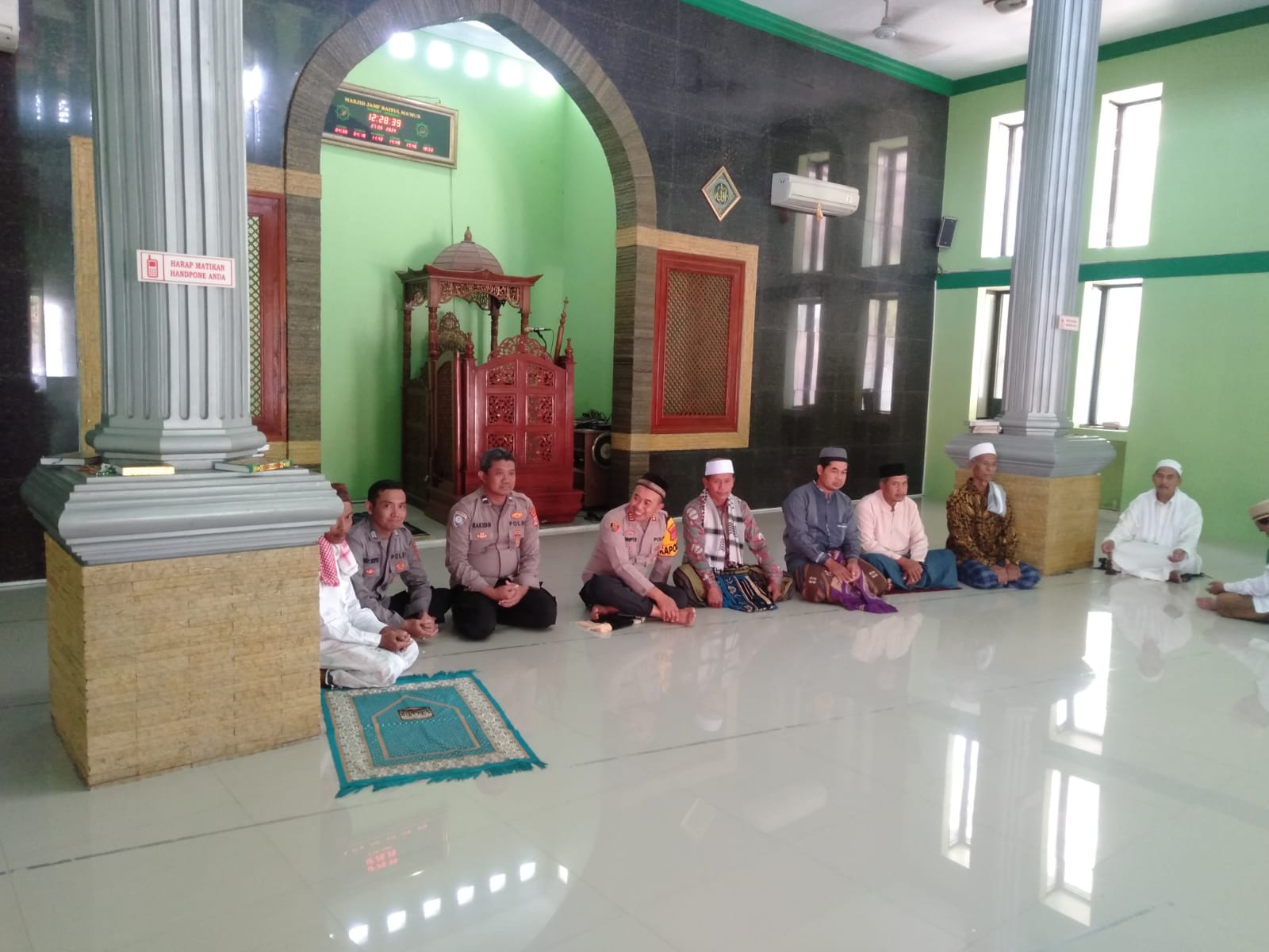Indramayu – Kapolsek Widasari, Polres Indramayu Polda Jabar, AKP Suripto, S.H., bersama Kanit Binmas, Aipda Sakudin, dan Bhabinkamtibmas, Bripka Suhendi, melaksanakan dialog dengan tokoh agama usai Sholat Jumat di Masjid Jami Baitul Makmur, Desa Bunder, Kecamatan Widasari. Jumat (27/9/2024)
