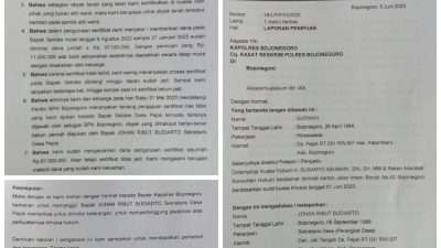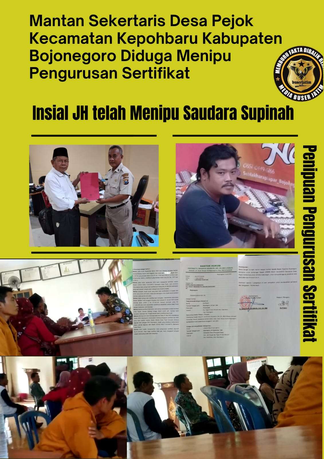 BUSERJATIM.COM || BOJONEGORO – Pria mantan Sekertaris Desa Pejok insial JH, telah Menipu Saudara Supinah, mantan Sekdes itu berdalih saya mengurus sertifikat dan pasti tidak lama, setelah berkas dan Dana 87,000,000 diserahkan kepada mantan carek Pejok sampai berbulan bulan sertifikat gak jadi sekdes itu berkali-kali bahkan terakhir kali nya dia berjanji pasti jadi pada tanggal 29 -05-2023, terus tanggal 30 masih belum jadi terus dicek sama saudara Supinah keluarga kekantor BPN ternyata tidak ada pengurus sertifikat atas nama Ayah dari Supinah, Saudara kakak dari Supinah mencari Sekdes kerumahnya dan kemana kemari tidak ditemukan guna untuk meminta pertanggung jawaban kepada sekdes Pejok. Selasa, 06/06/2023.
