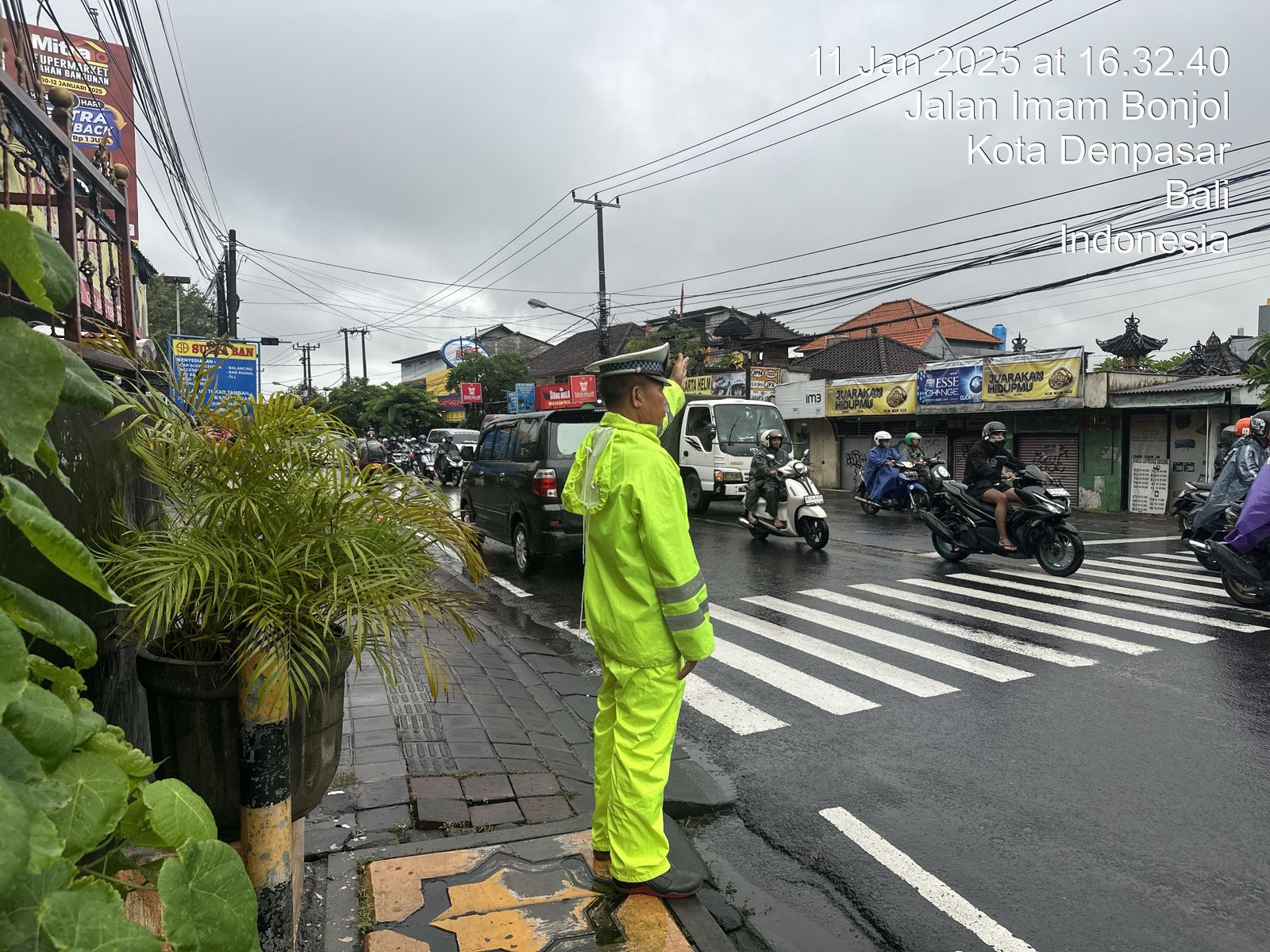 Tampak dilapangan, dengan berseragam lengkap, rompi dan jas hujan, beberapa polantas Polsek Denpasar Barat tengah sibuk mengatur lalu lintas di titik-titik lokasi jalan yang sering macet.