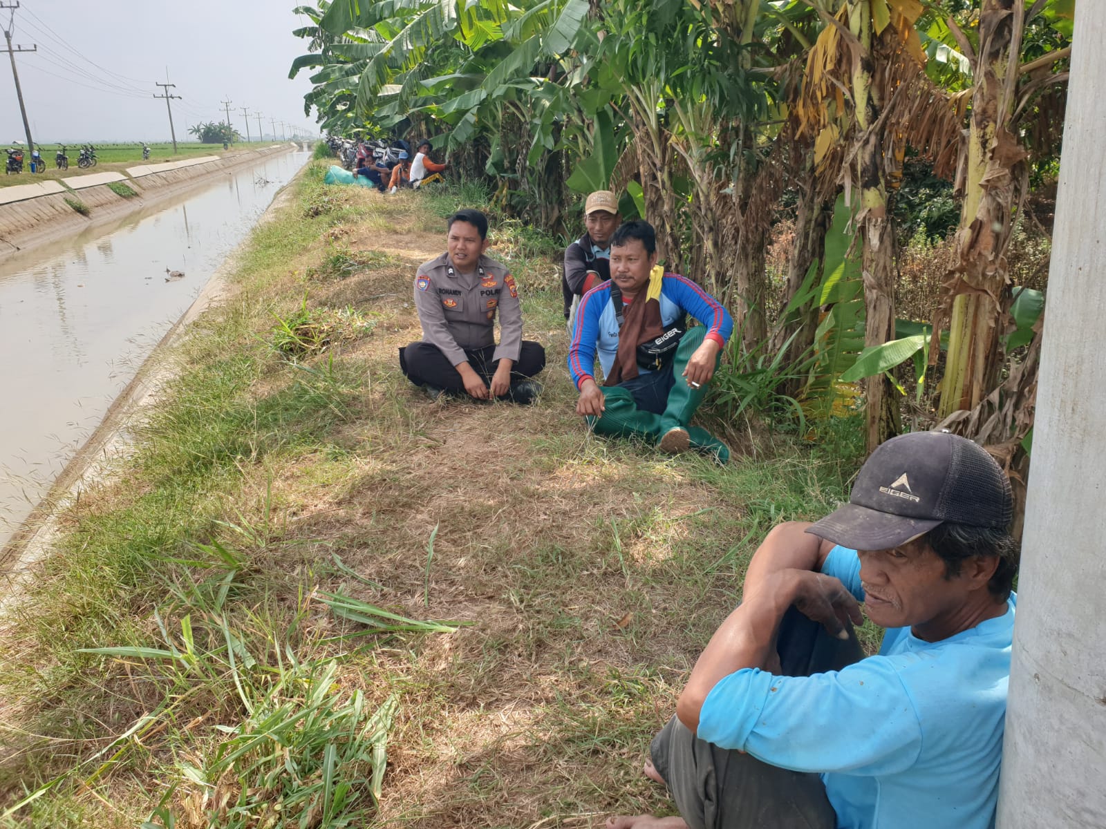 Duduk lesehan di pinggir saluran irigasi, Briptu Dede berdialog santai sambil menyampaikan pesan-pesan kamtibmas.