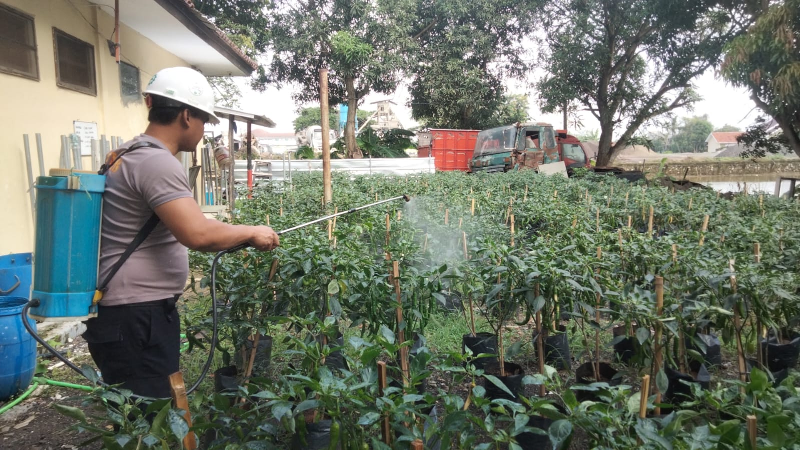 Indramayu – Anggota Polsek Widasari Polres Indramayu Polda Jabar melakukan penyemprotan insektisida dan fungisida pada tanaman cabai merah besar yang ditanam di Pekarangan Bergizi di lingkungan Mako Polsek Widasari, Sabtu (1/2/2025).