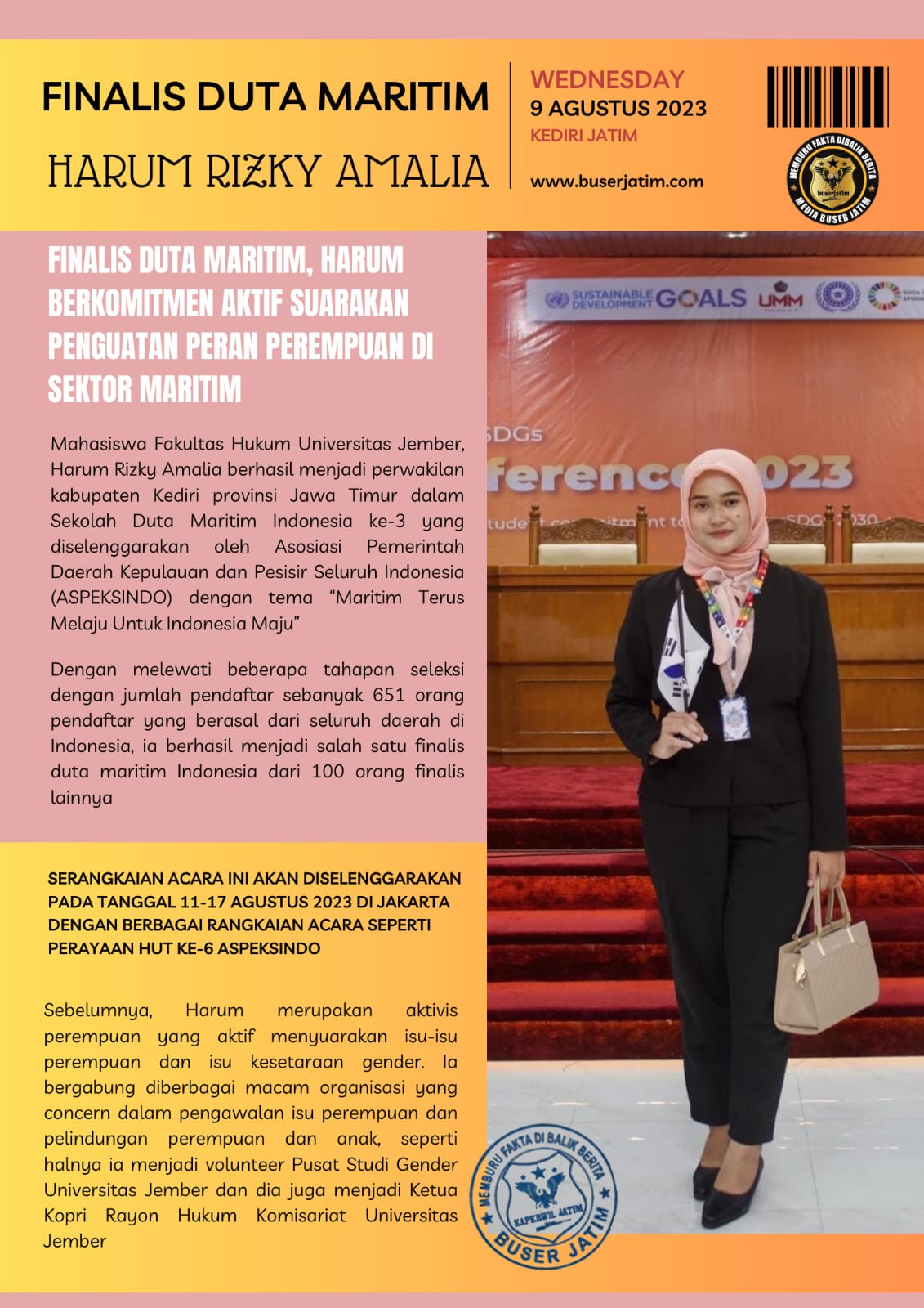 BUSERJATIM.COM || KEDIRI JATIM – Mahasiswa Fakultas Hukum Universitas Jember, Harum Rizky Amalia berhasil menjadi perwakilan kabupaten Kediri provinsi Jawa Timur dalam Sekolah Duta Maritim Indonesia ke-3 yang diselenggarakan oleh Asosiasi Pemerintah Daerah Kepulauan dan Pesisir Seluruh Indonesia (ASPEKSINDO) dengan tema “Maritim Terus Melaju Untuk Indonesia Maju”. Serangkaian acara ini akan diselenggarakan pada tanggal 11-17 Agustus 2023 di Jakarta dengan berbagai rangkaian acara seperti perayaan HUT Ke-6 ASPEKSINDO, pembekalan seputar kemaritiman, Kunjungan beberapa instansi pemerintahan, hingga upacara kemerdekaan RI.