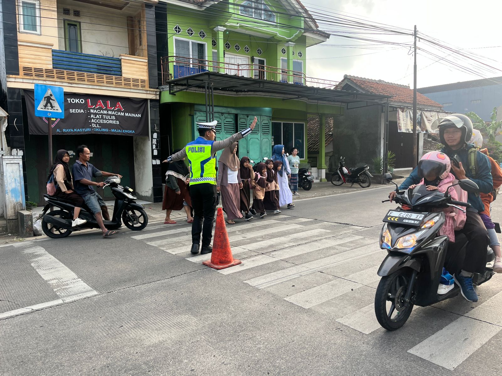 Majalengka – Polsek Cikijing Polres Majalengka Polda Jabar terus berupaya memastikan kelancaran arus lalu lintas serta meningkatkan keamanan dan keselamatan pengguna jalan. Anggota Satlantas Bripda Muhammad Thoriq R. melaksanakan Protap Pelayanan Gatur Lalin di Jl. Raya Cikijing-Talaga tepatnya di SDN 1 Kasturi, Kecamatan Cikijing, Rabu (15/10/2025).