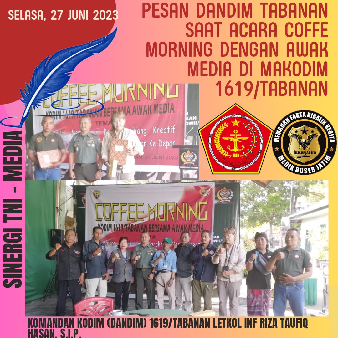 BUSERJATIM.COM || TABANAN – Untuk mempererat komunikasi antar institusi TNI dan para awak media, Komandan Kodim (Dandim) 1619/Tabanan Letkol Inf Riza Taufiq Hasan, S.I.P., Menggelar kegiatan coffee morning Bersama Insan Pers yang bertema “Sinergitas Membangun Karakter yang Kreatif, Cerdas, Bijak dan Siap Menghadapai Tantangan Kedepan” di Makodim 1619/Tabanan.