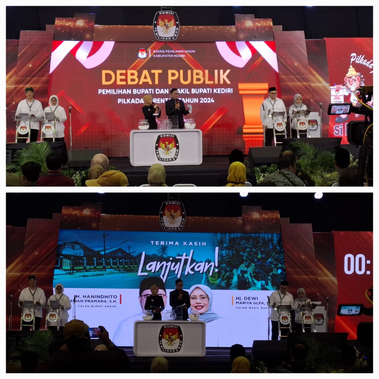 KEDIRI,BUSERJATIM.COM-Kamis 14/11/2024,Komisi Pemilihan Umum (KPU)Kabupaten Kediri,menggelar Debat Publik ke dua dan terahkir,dalam gelar debat publik Paslon dengan nomor urut satu(1) Deny Widyanarko dan Mudawamah dengan rivalnya Nomor urut Dua(2) Hanindhito Himawan Pramana dan Dewi Maria Ulfa beradu Visi dan Misi untuk Menentukan Pilihan Masyarakat Kabupaten kediri 5 tahun kedepan acara malam ini berlangsung di Convention Hall Simpang Lima Gumul (SLG)