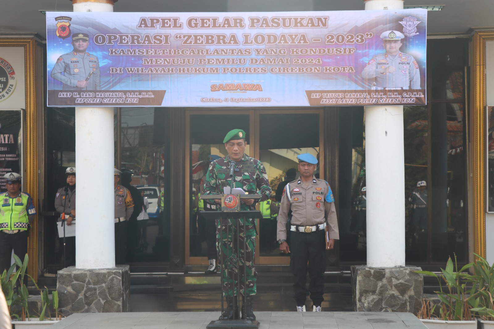 Bertindak selaku pimpinan apel Dandim 0614 Kota Cirebon LETKOL Robil Syaifullah di dampingi Dandenpom III/SLW LETKOL. Cpm. Mudhofar, S.Pd.,Serta di Hadiri Wakapolres Cirebon Kota Kompol Ahmat Troy Aprio S.H.,S.Ik,Kasat Pol PP Kota Cirebon EDI SISWOYO, S.AP, PJU Polres Cirebon Kota,Perwira serta Seluruh Peserta Apel Gelar Pasukan Ops Zebra Lodaya 2023.