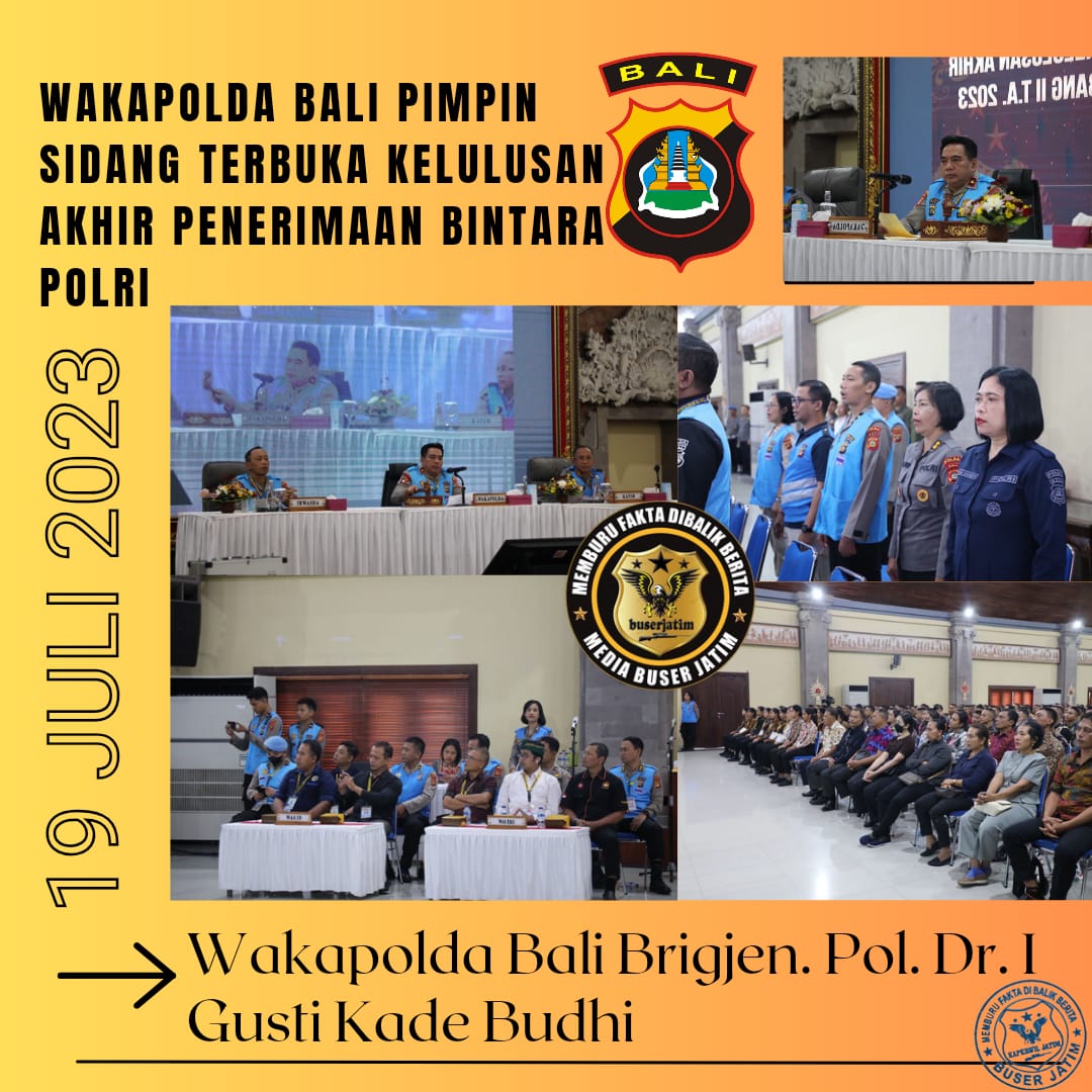 BUSERJATIM.COM || BALI – Didampingi Pejabat Utama (PJU) Polda Bali, Wakapolda Bali, Brigjen. Pol. Dr. I Gusti Kade Budhi Harryarsana, S.I.K., S.H., M.Hum., memimpin sidang terbuka kelulusan akhir penerimaan Bintara Polri Gelombang II T.A. 2023 di gedung Perkasa Raga Garwita (PRG), Rabu (19/7/2023).