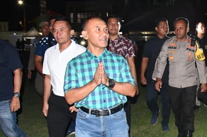 Menggunakan kemeja warna tosca kotak-kotak dan celana jeans, kedatangan Danrem di sana tampak disambut meriah oleh para penonton yang memadati Stadion Wilis.