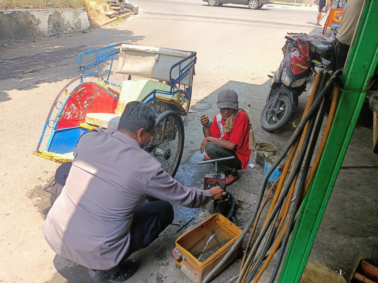 Seperti halnya yang dilakukan anggota Bhabinkamtibmas Kelurahan Kejaksan Polsek Utbar Polres Cirebon Kota Bripka Pendy Tristiyanto, SH laju motornya terhenti saat melakukan patroli di wilayah binaan dan melihat seorang tukang becak yang menambal roda ban yang bocor. Jumat (03/11/2023)