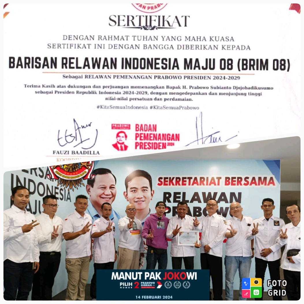 BRIM-08 sendiri sudah mendapatkan sertifikasi relawan dari Rumah Besar Pemenangan Prabowo- Gibran di Slipi Jakarta pusat yang di tandatangani oleh Koordinator Fauzi Baadilla dan Haris Rusly Moti sebagai Wakil Koordinator.