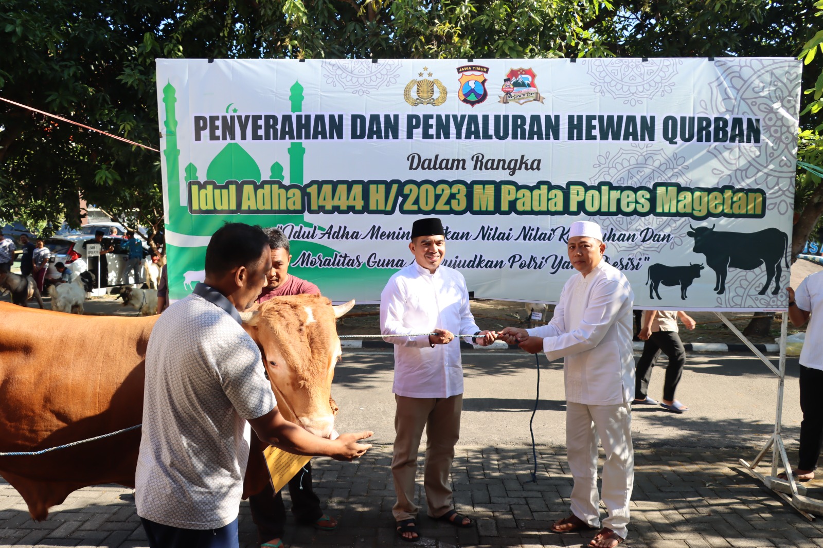 Lebih lanjut dikatakan Kapolres Magetan bahwa hewan-hewan qurban tersebut diberikan kepada, 1 (satu) ekor sapi diserahkan kepada Pengurus Cabang NU dan kambing juga diserahkan kepada penerima Korban