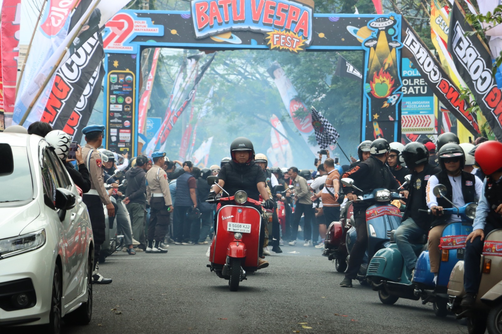 “Selamat datang di Kota Batu, Salam Satu Vespa Sejuta Saudara di Hari Bhayangkara ke -79,dengan ini Batu Vespa Fest 2025 dibuka,”