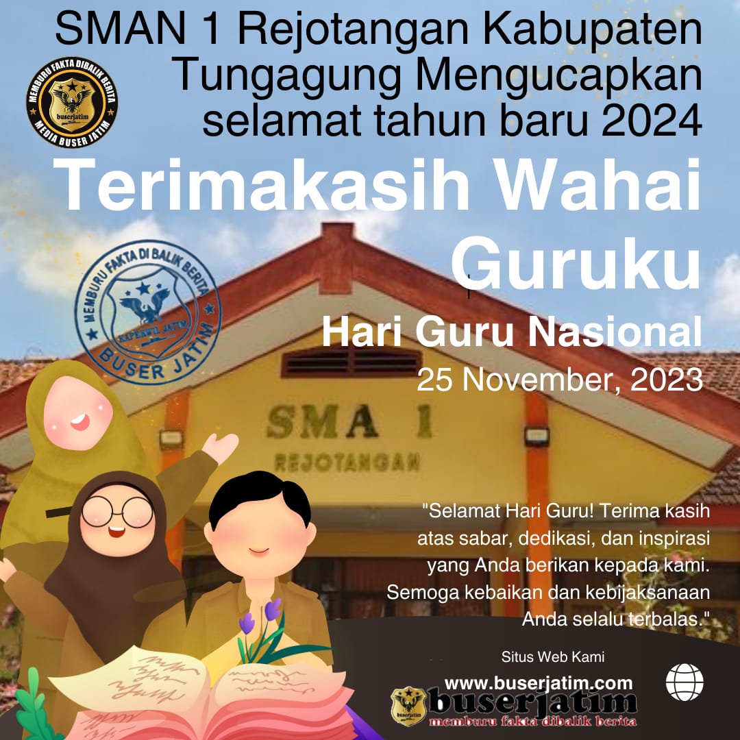 BUSERJATIM.COM || TULUNGAGUNG – Kepala Sekolah SMAN 1 Rejotangan Tulungagung beserta staf, mengucapkan Hari Natal dan Tahun Baru (Nataru) 2024.