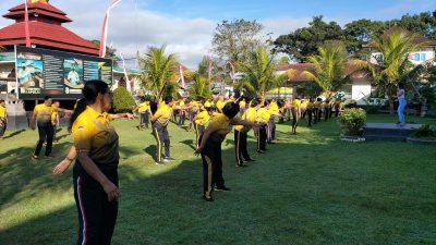 Setelah arahan Kabag SDM kompol Made Adi Suryawan, Sh., MM dilanjutkan dengan olah raga bersama dengan dipandu pesenam agar badan sehat guna menunjang pelaksanaan tugas dan diakhiri pelaksanaan kurve di sekitar lingkungan Kantor termasuk di Pura Giri Brata menjelang menyambut hari Galungan lan Kuningan. Hms.