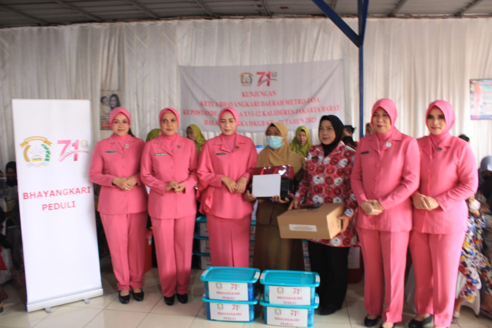 Ketua Bhayangkari Daerah Metro Jaya Ny. LINNA KARYOTO beserta pengurus, Ketua Bhayangkari Cabang Jak-Bar Ny. IKA SYAHDUDDI beserta pengurus, Ketua Bhayangkari Ranting Kalideres Ny. DEVI SYAFRIE beserta pengurus, Kapolsek Kalideres AKP SYAFRI WASDAR, SH, MH, Camat Kalideres WUKIR PRABOWO.