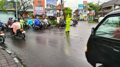 Hal ini nampak 2 personil Lalu Lintas Polsek Kuta Utara di simpang Berawa dan Padonan Desa Tibubeneng mengenakan jas hujan warna hijau menyala terlihat tak mempedulikan hujan yang mengguyur dan tetap melakukan tugasnya mengatur arus lalu lintas.