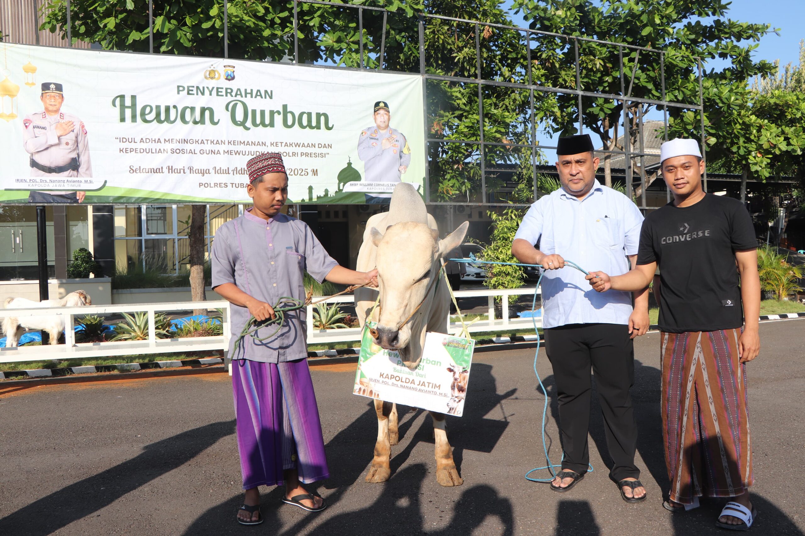 Penyerahan hewan kurban tersebut dilakukan secara simbolis oleh Kapolres Tuban, AKBP William Cornelis Tanasale, S.I.K., kepada perwakilan dari masing-masing penerima.
