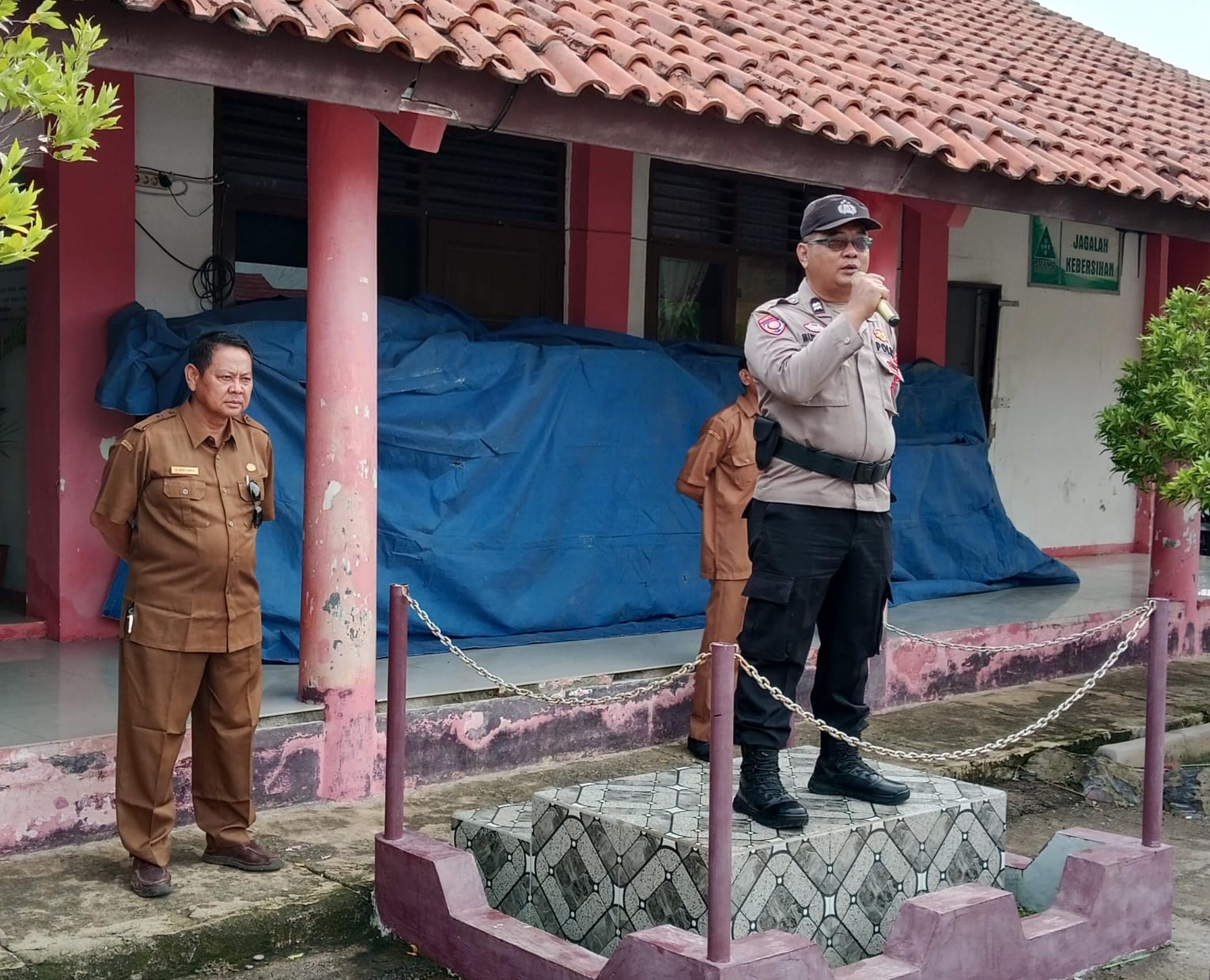 Panit Binmas menyampaikan pesan kamtibmas kepada seluruh peserta upacara, khususnya tentang bahaya kenakalan remaja dan masalah tawuran di kalangan pelajar.