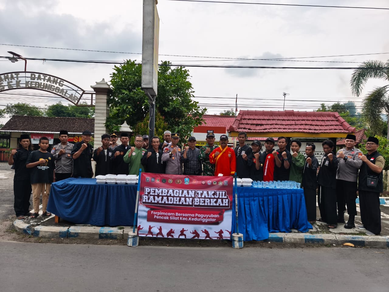 Ngawi – Dalam rangka menjaga keamanan dan kenyamanan warga selama bulan suci Ramadan, Babinsa Koramil Kedunggalar, Kodim 0805/Ngawi bersama anggota Polsek Kedunggalar melaksanakan pengamanan kegiatan pembagian takjil serta pemasangan banner ucapan Ramadan yang digelar paguyuban pencak silat di wilayah Kecamatan Kedunggalar, Kabupaten Ngawi. Minggu (22/2/2026).