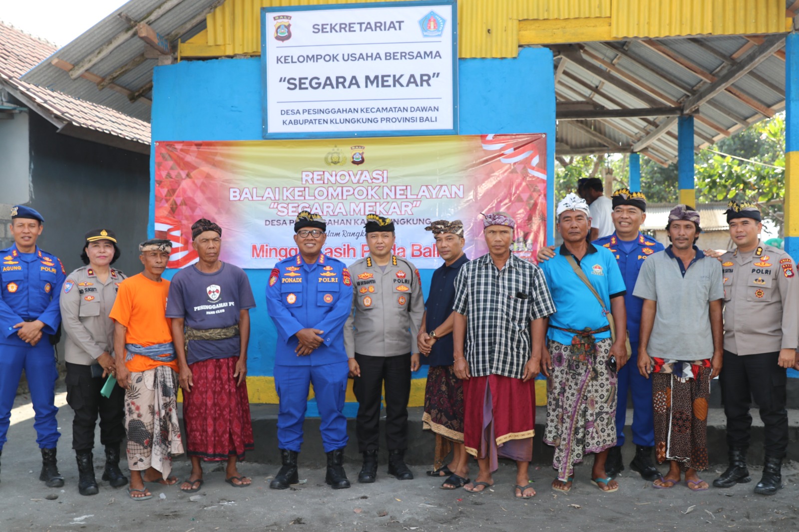 Acara diawali dengan peletakan Prasasti Balai Kelompok Nelayan Segara Mekar oleh Dirpolairud Polda Bali yang di dampingi PJU Polda Bali yang hadir beserta Jero Bendesa, Mekel Desa Pesinggahan dan Ketua Kelompok Nelayan Segara Mekar.