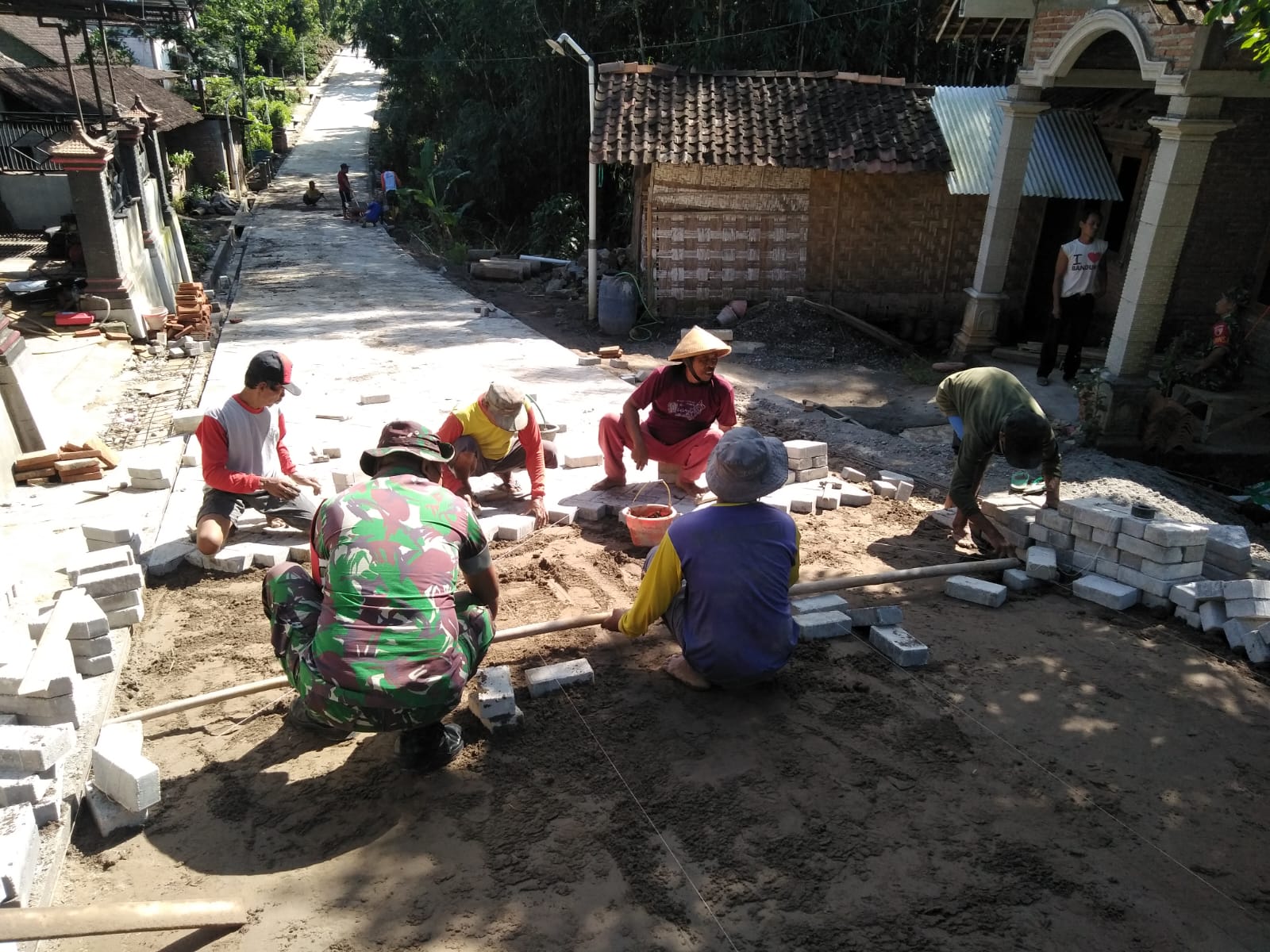 Pemasangan Paving ini bertujuan agar jalan menjadi bagus sehingga memperlancar untuk akses kendaraan ataupun jalan kaki,ucap Serka Handri di sela-sela kegiatannya.
