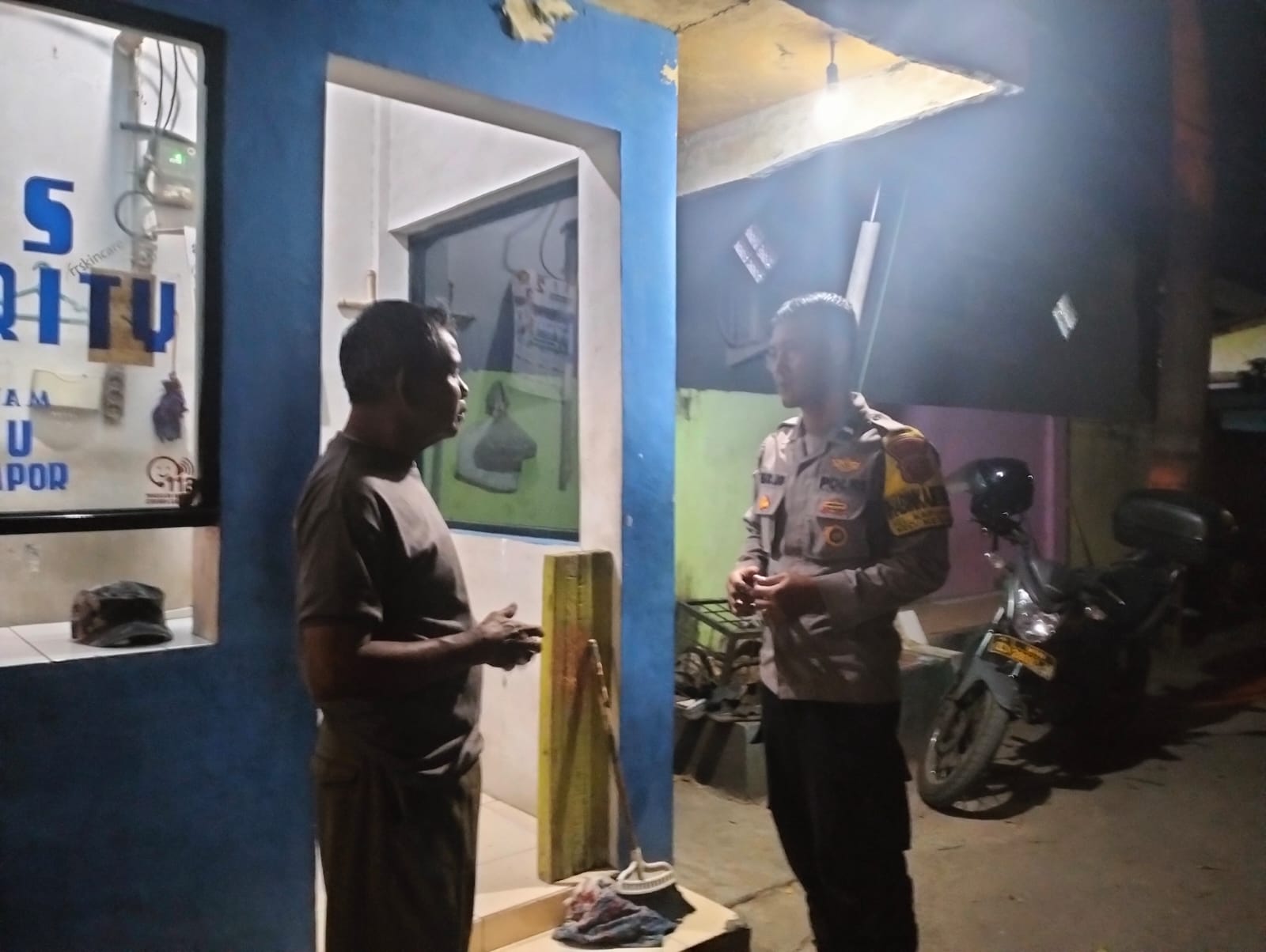 Bhabinkamtibmas Kelurahan karya Mulya Aipda Eko , sammbangi sambangi petugas satpam perumahan harapan mulya melalui berikan binluh Kamtibmas,Sabtu malam (20/07/2024).