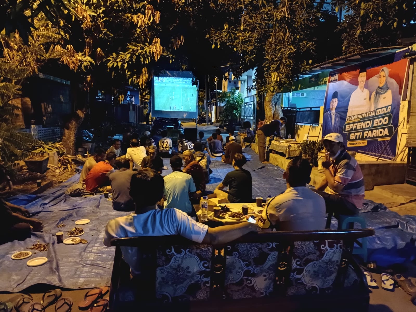 Polsek Seltim Polres Cirebon kota Polda Jabar berikan pengamanan melalui Bhabinkamtbmas kelurahan kecapi Aipda Rudianto dengan nonton bareng laga pertandingan sepak bola yang disiarkan langsung oleh salah satu stasiun televisi swasta , bersama warga masyarakat di RW 15 kelurahan kecapi kecamatan Harjamukti Cirebon kota , Jumat malam (11/10/2024).