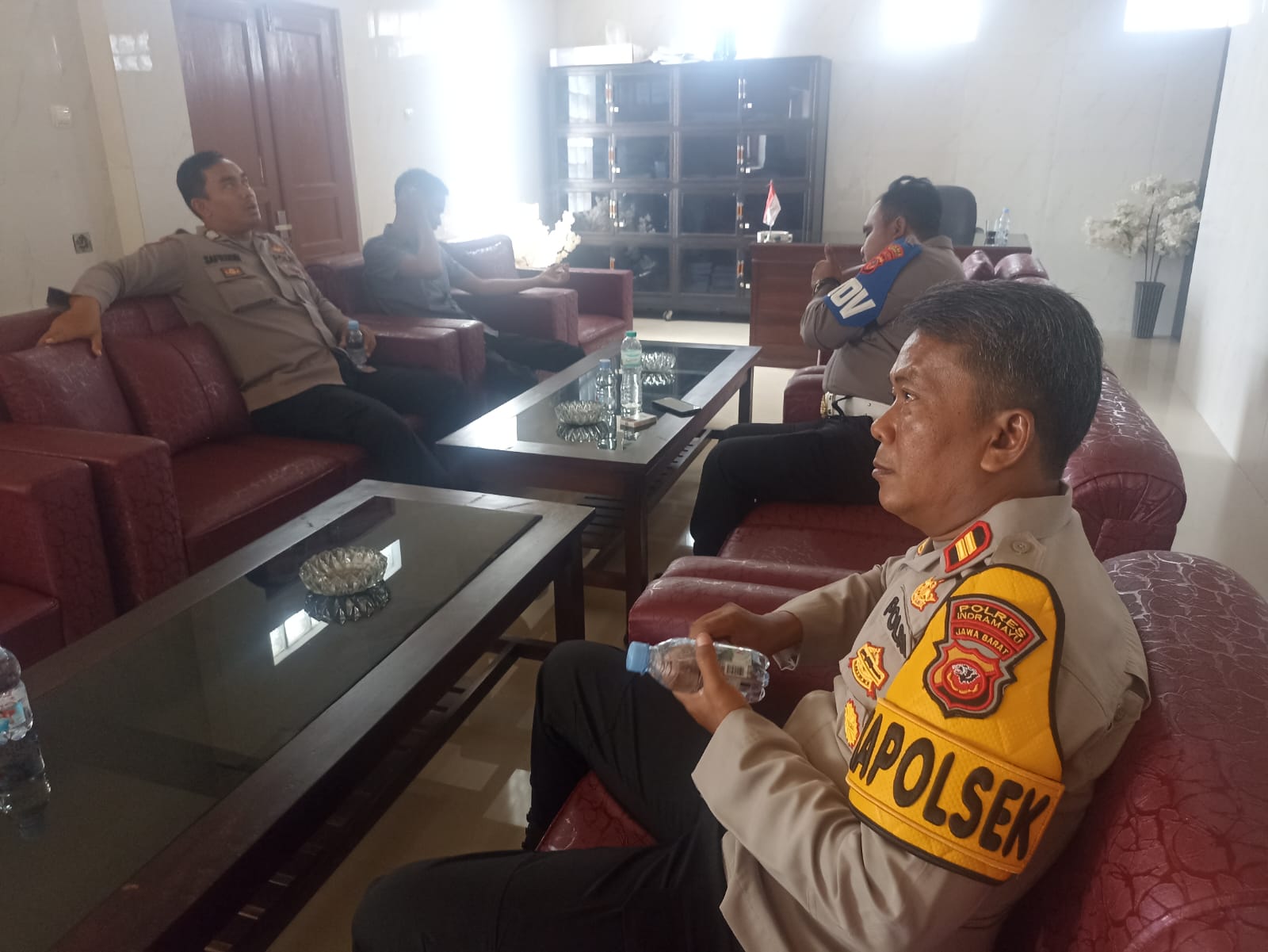 Kedatangan personel kepolisian disambut hangat oleh perangkat desa, termasuk staf administratif yang sedang melakukan pelayanan kepada masyarakat.