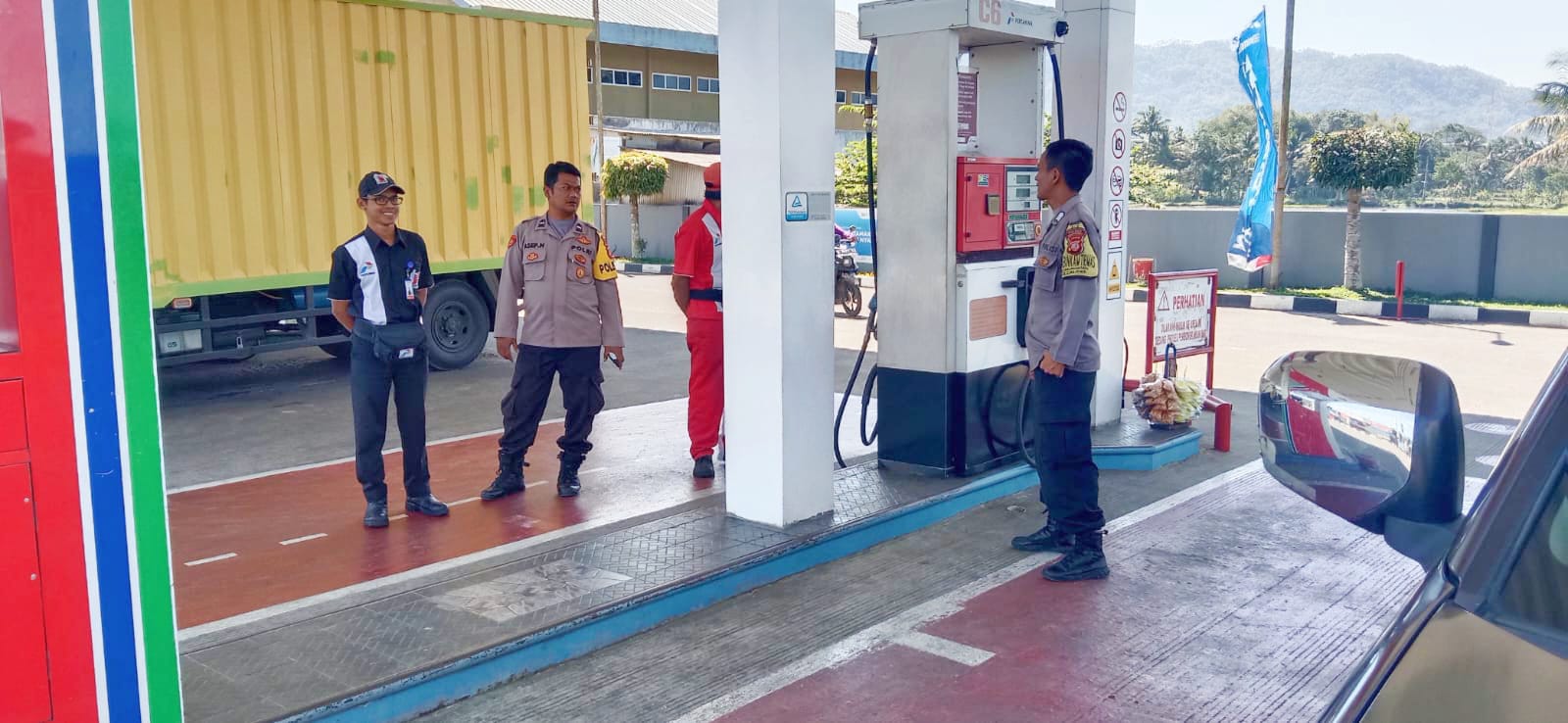 Majalengka – Ka SPKT l Polsek Cikijing Polres Majalengka Polda Jabar Aipda Asep Nugroho dan Bhabinkamtibmas Bripka Achmad Supriyono melakukan Pengamanan dan monitoring di SPBU Cikijing Kabupaten Majalengka, Jum’at (28/07/2023).