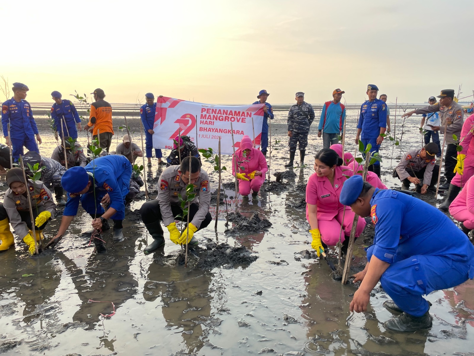 Ketua Bhayangkari Ny. Cania Rezi Dharmawan, Wakapolres Kompol Indah Citra Fitriani dan Forkopimka Panarukan, TNI AL Panarukan, serta Kades Duwet Adi Chandra dan Kelompok Masyarakat Pesisir Peduli Mangrove.