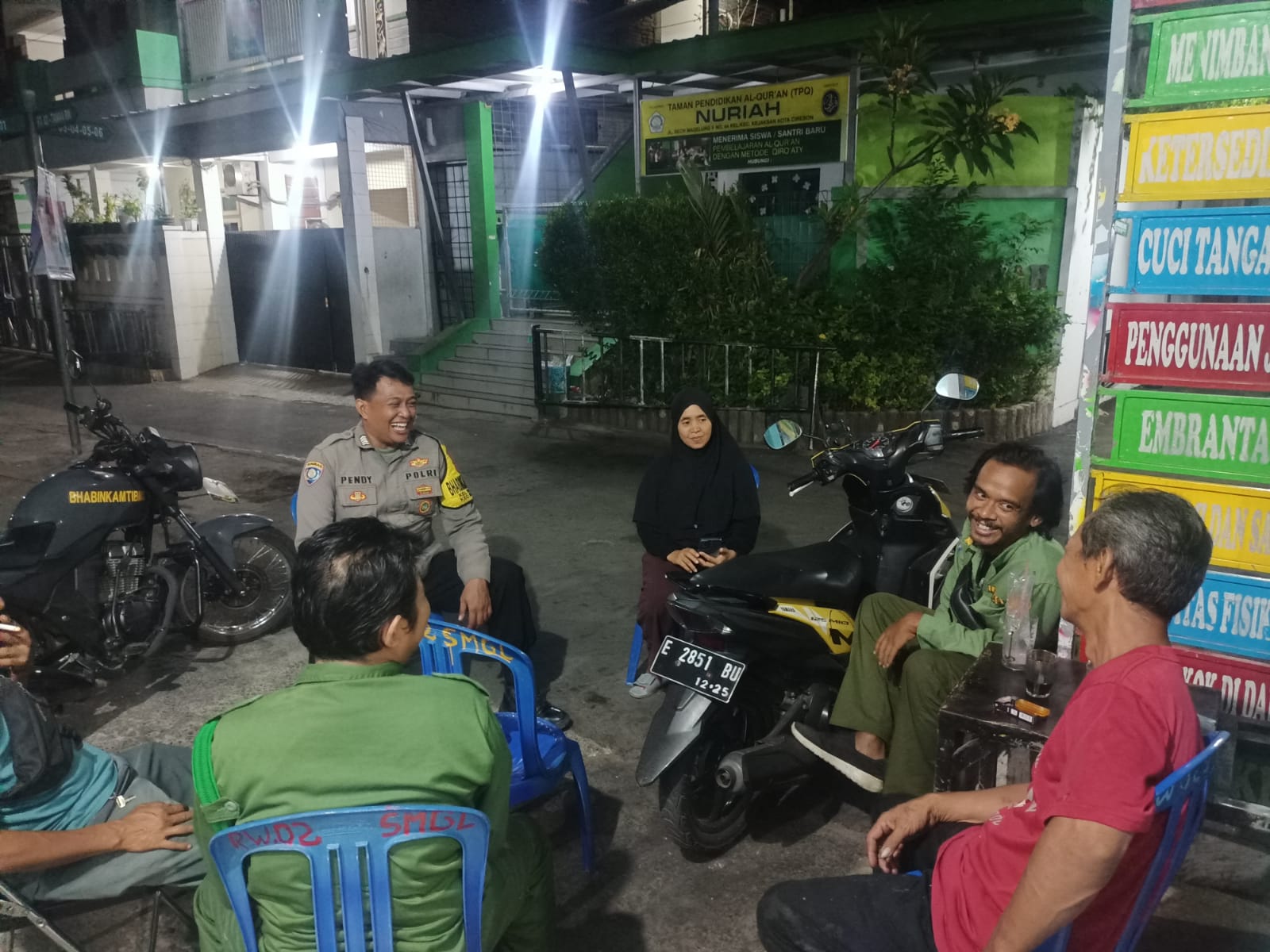 Jajaran Bhabinkamtibmas Polsek Utbar Polres Cirebon Kota Polda Jabar melaksanakan sambang patroli wilayah binaan, Seperti yang di lakukan Bripka Pendi Bhabinkamtbmas kelurahan kejaksan bersama Babinsa kepada warga saat jaga malam di poskamling RW 02 syekh Magelung kelurahan kejaksaan, Minggu malam (03/11/2024).