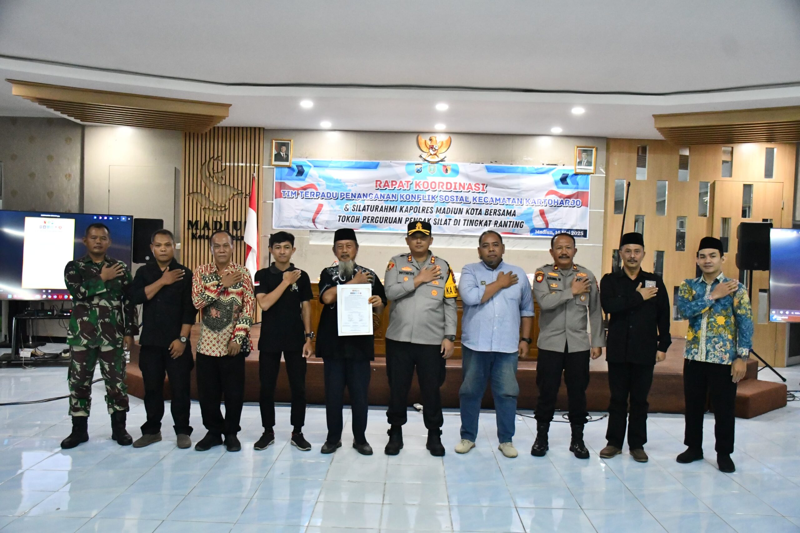 Rapat yang berlangsung sejak pukul 19.30 hingga 21.20 WIB ini dihadiri sekitar 100 peserta, termasuk Kapolres Madiun Kota AKBP Wiwin Junianto Supriyadi, Camat Kartoharjo Agus Budiarto SH, Kapolsek Kartoharjo, Danramil, lurah se-Kecamatan Kartoharjo, dan seluruh pengurus perguruan pencak silat seperti PSHT, PSHW TM, IKS PI, Merpati Putih, Pandan Alas, dan lainnya.
