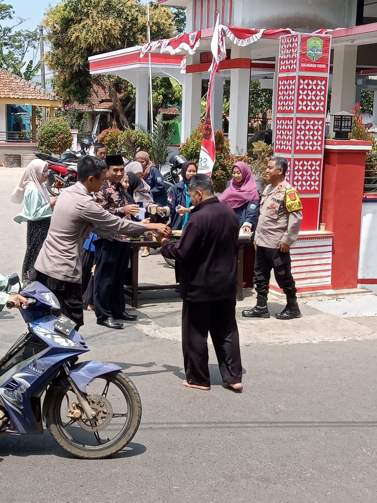 Majalengka – Kapolsek Cikijing Polres Majalengka Polda Jabar Kompol Romdani, S.H didampingi Bhabinkamtibmas Desa Banjaransari Bripka Achmad Supriyono bersama Kepala Desa Banjaransari dan Mahasiswa UNISA Kuningan menggelar kegiatan Jum’at Berkah berupa pembagian makanan kepada warga di depan halaman Masjid Jamie Al-Amin Desa Banjaransari, Jumat (01/09/2023).