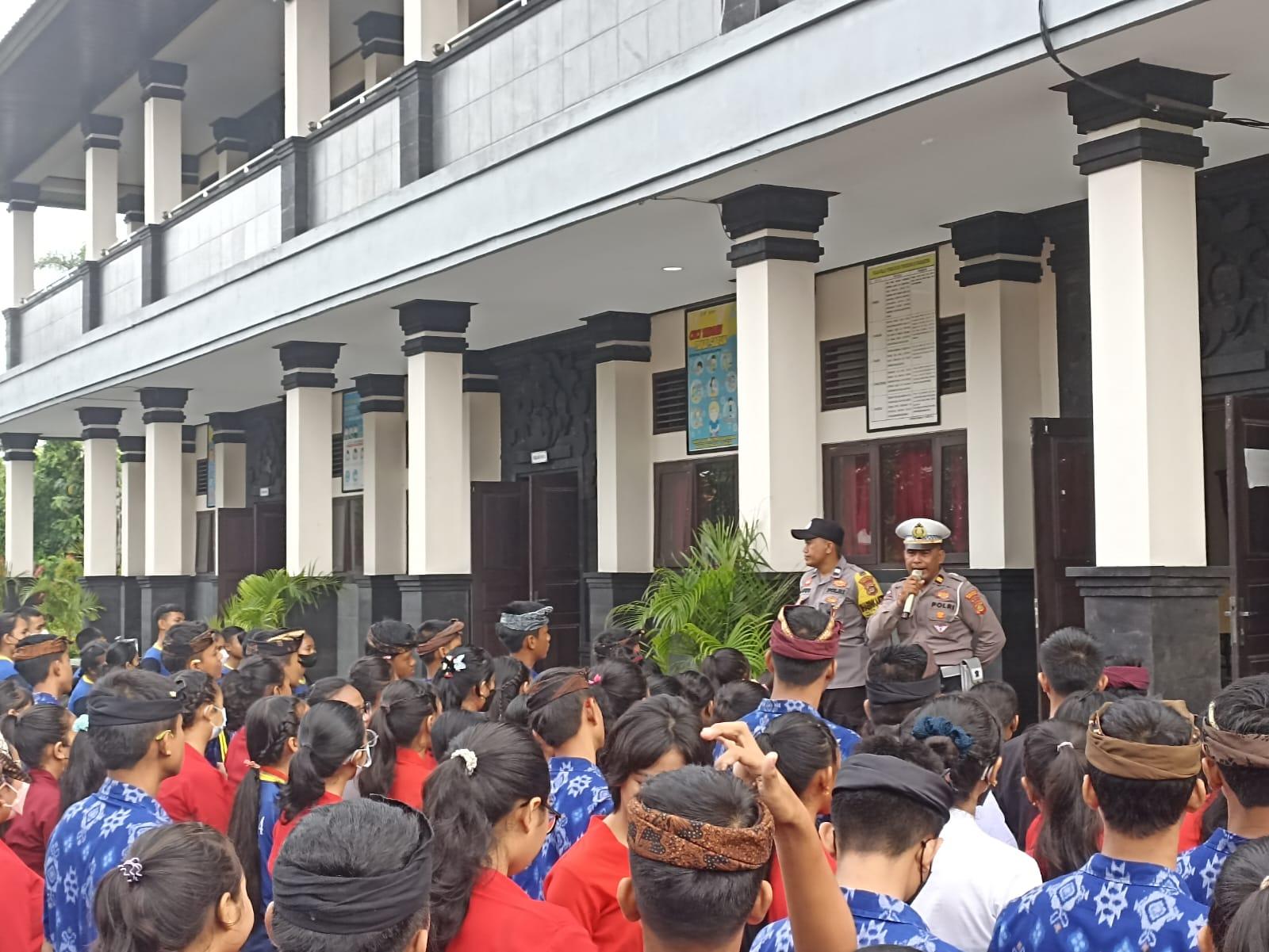 Bhabinkamtibmas Desa Canggu Aiptu Putu Agus Wahyu SH saat sosialisasi ikut memberikan imbauan kepada anak anak sekolah agar tidak terpengaruh dengan kenakalan remaja seperti bolos sekolah, corat – Coret tembok dan tawuran.