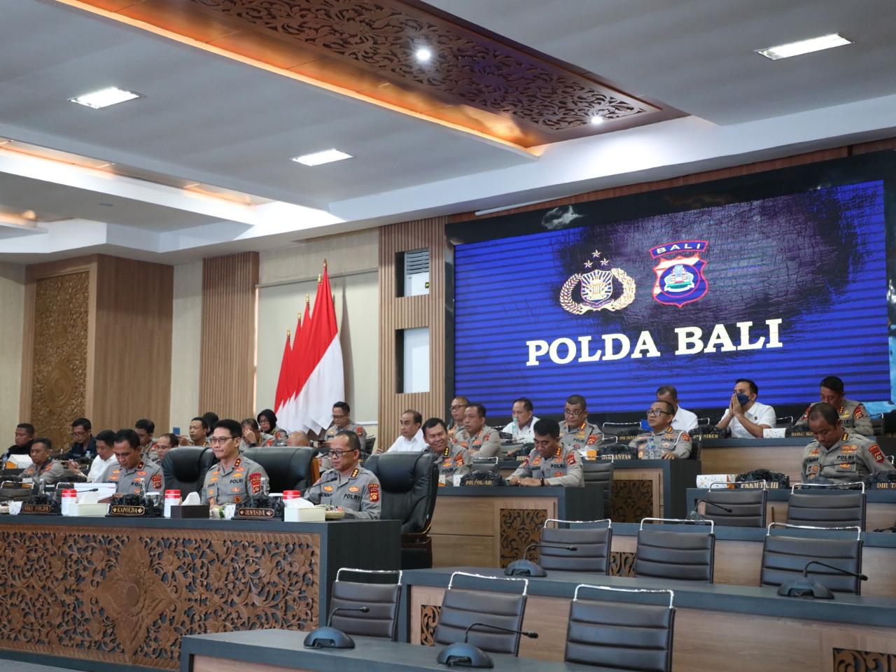 Kapolda Bali, Irjen Pol. Daniel Adityajaya, S.I.K., M.Si., didampingi oleh Wakapolda Bali Brigjen. Pol. I Komang Sandi Arsana, S.I.K, M.H. Dan Pejabat Utama Polda Bali menerima arahan dari Kapolri, Jenderal Pol. Drs. Listyo Sigit Prabowo, M.Si. Melalui Video Conference (Vicon). Terkait Kesiapan pengamanan peringatan Hari Buruh Internasional (May Day) yang jatuh pada tanggal 1 Mei. Yang berlangsung diruang Rupatama Polda Bali.