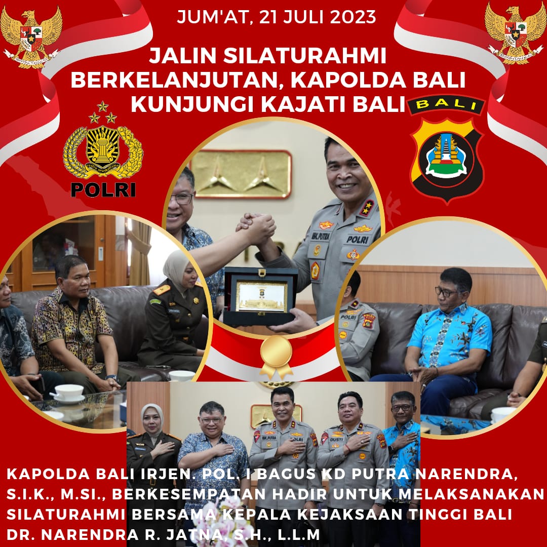 Kedatangan Rombongan Polda Bali di Kantor Kejaksaan Tinggi Bali ini merupakan yang pertama dilaksanakan setelah Irjen. Pol. I Bagus Kd Putra Narendra, S.I.K., M.Si., menjabat sebagai Kapolda Bali. Selain sebagai bentuk silaturahmi Forum Koordinasi Pimpinan Daerah (Forkopimda) Bali, kunjungan ini juga untuk mempererat jalinan kerjasama berkelanjutan antara Polda Bali dan Kejati Bali yang merupakan unsur penegak hukum di Wilayah Bali.