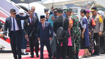 Kepala Kepolisian Daerah Bali, Irjen. Pol. Ida Bagus Kd Putra Narendra, S.I.K., M.Si., menyambut kedatangan Wakil Presiden Republik Indonesia, Prof. Dr. K.H. Ma’ruf Amin beserta Ibu Hj. Wury Estu Ma’ruf Amin di Bandara I Gusti Ngurah Rai, Senin (16/10/2023).