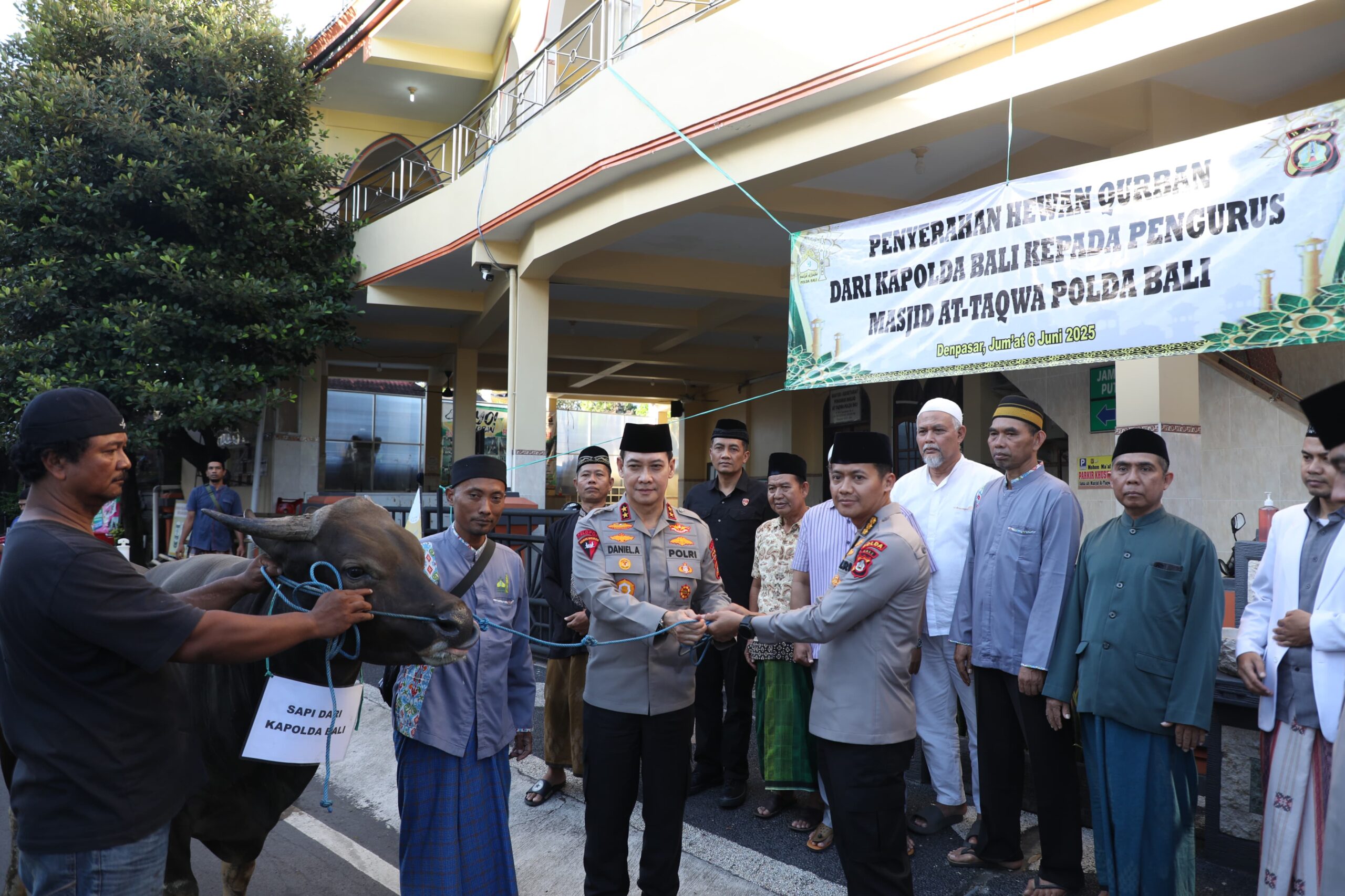 Kepala Kepolisian Daerah Bali, Irjen Pol. Daniel Adityajaya, S.H., S.I.K., M.Si. bersama Wakapolda Bali, Brigjen Pol. I Komang Sandi Arsana, S.I.K., M.H. menyerahkan sapi qurban dalam rangka hari raya Idul Adha 1446 H / 2026 M di depan Masjid At-Taqwa Polda Bali, Jalan WR Supratman, Denpasar, Kamis (5/6/2025).