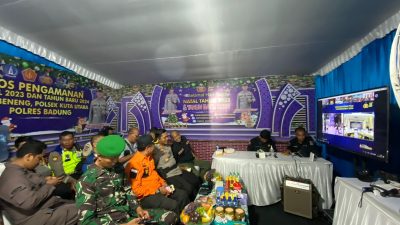 Kepala Kepolisian Resor Badung AKBP Teguh Priyo Wasono, SIK mengikuti Malam pergantian tahun 2024, secara virtual melalui zoom meeting dengan Kapolri Jenderal Polisi Drs. Listyo Sigit Prabowo, M.Si di Pos Pengamanan yang berlokasi di Depan Lapangan Berawa, Desa Tibubeneng, Kecamatan Kuta Utara, Kabupaten Badung, Bali. Minggu, (31/12/2023) mulai pukul 21.00 WITA.