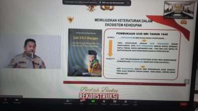 Bangli – Bertempat di Rupatama Polres Bangli, Pejabat Utama Polres Bangli di pimpin Kapolres Bangli Akbp I Dewa Agung Roy Marantika SH., S.J.K mengikuti kegiatan Bedah Buku Rekontruksi Nasionalisme dalam rangka memperingati hari Bhayangkara Ke-77 melalui aplikasi zoom meeting, Kamis 1 Juni 2023.
