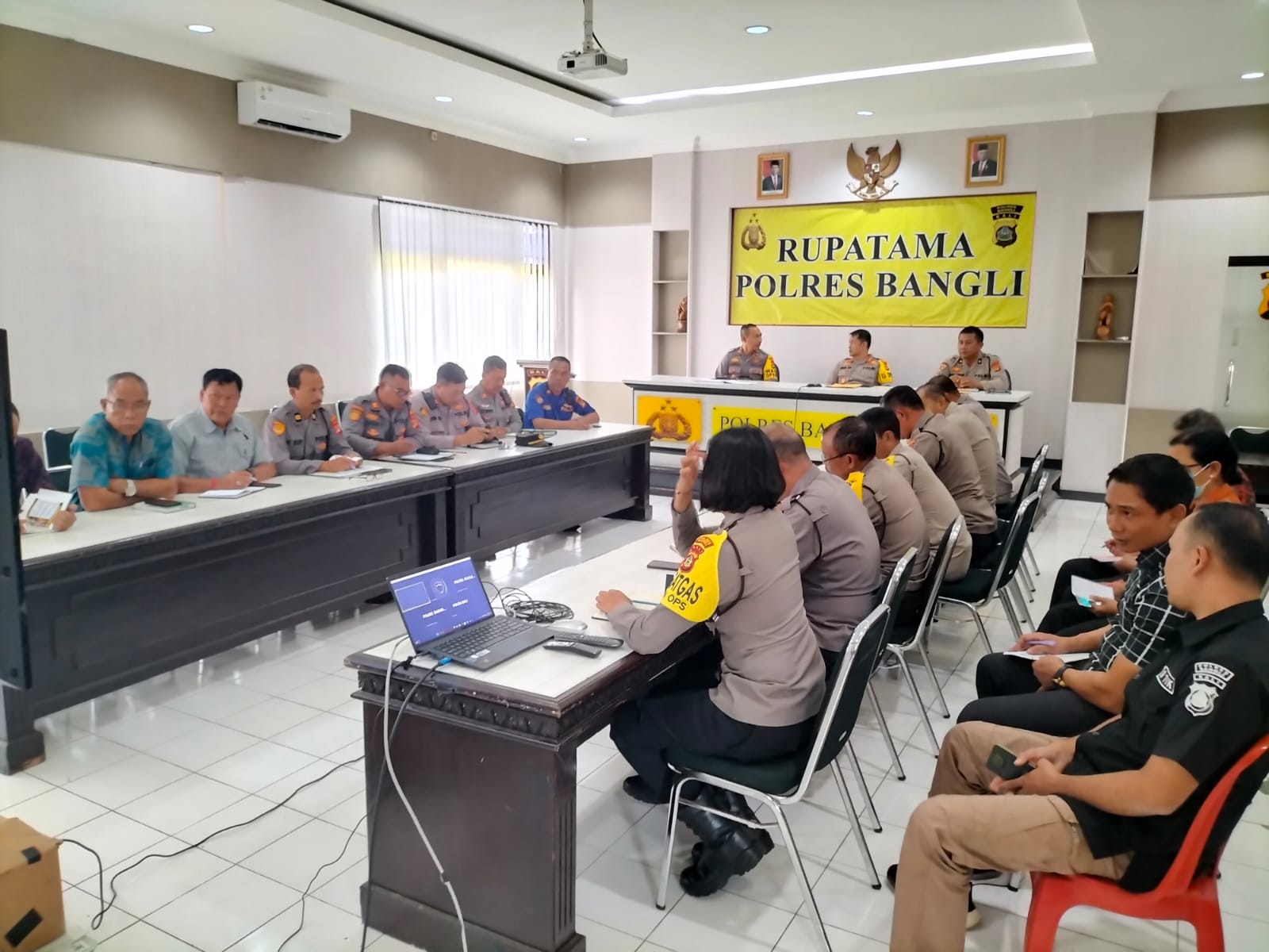 Dalam rangka Persiapan Pelaksanaan Pemilu Tahun 2024, Kapolres Bangli Akbp I Dewa Agung Roy Marantika, Sh., S.I.K didampingi Waka Polres, Kabag SDM dan para pejabat Utama serta Kapolsek jajaran mengikuti kegiatan anev Kamtibmas terkini dan anev Posko Presisi melalui Vidcon yang di terima di Rupatama Polres Bangli. Selasa (15/8)