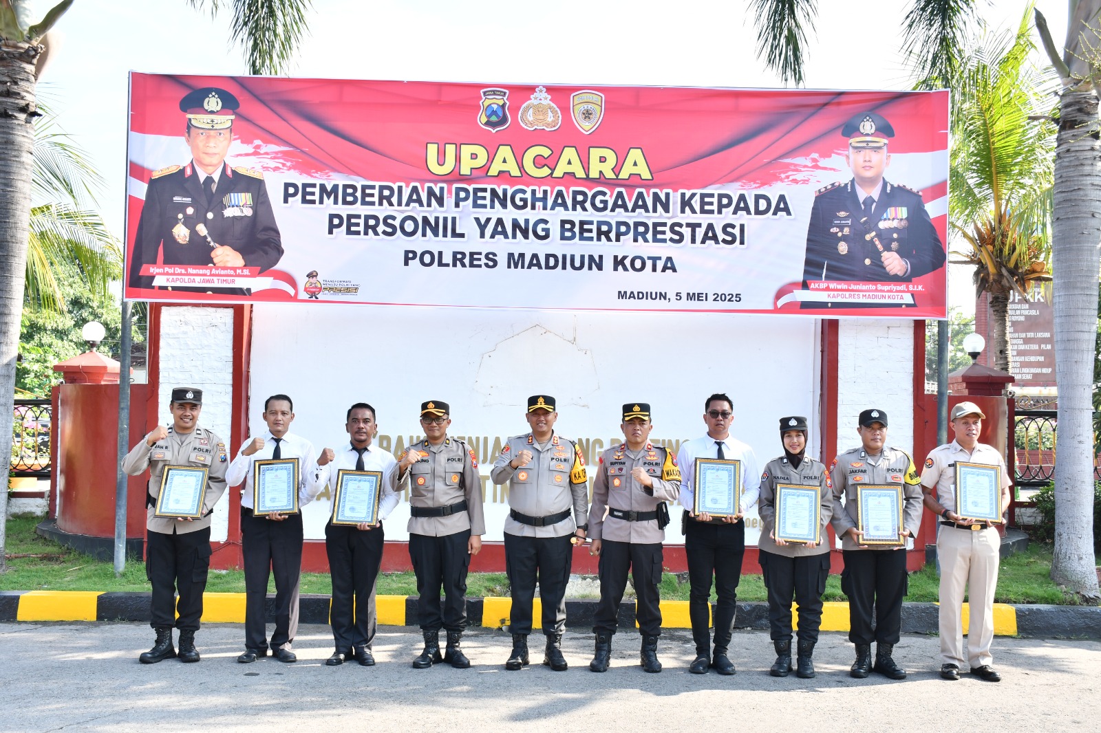 MADIUN, BUSERJATIM.COM — Kapolres Madiun Kota, AKBP Wiwin Junianto Supriyadi, S.I.K., memberikan penghargaan kepada tujuh personel Polres Madiun Kota yang dinilai berprestasi dalam pelaksanaan tugas kepolisian. Upacara penghargaan berlangsung di halaman Mapolres Madiun Kota pada Senin (5/5).