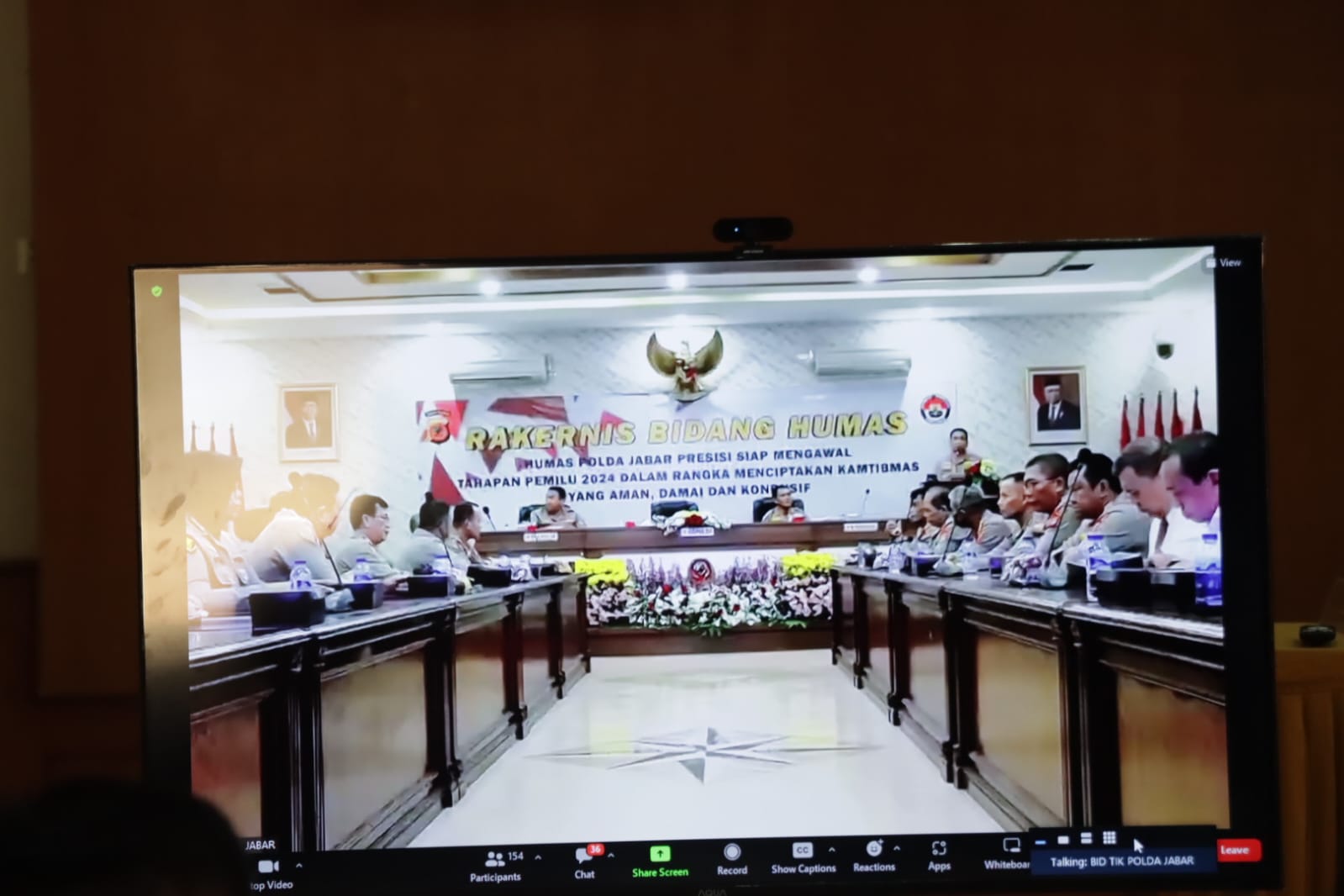 Majalengka, Kapolres Majalengka AKBP Indra Novianto,S.I.K. didampingi Wakapolres Majalengka KOMPOL Bayu Purdantono,S.I.K.,M.I.K. serta PJU dan Kapolsek Jajaran Polres Majalengka mengikuti Zoom Meeting Pembukaan Rakernis Humas bertempat di aula kanyawasista, Senin (26/6/2023).