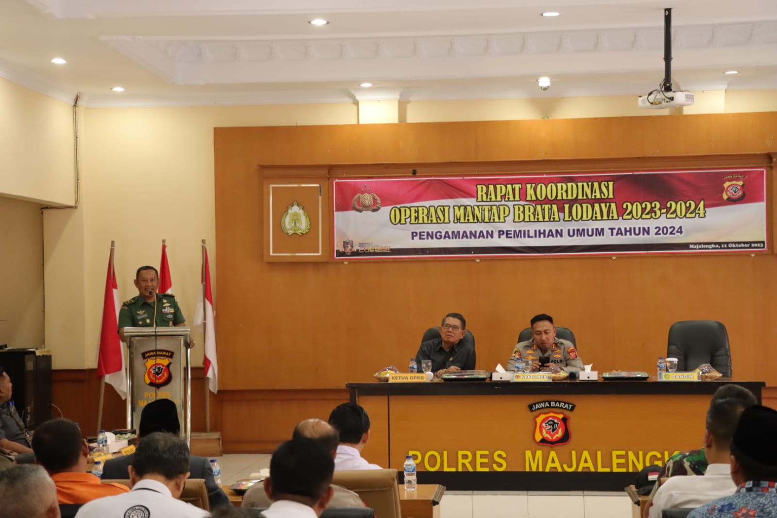 Majalengka – Kapolres Majalengka Polda Jabar, AKBP Indra Novianto, S.I.K., M.Si., CPHR, memimpin Kegiatan Rapat Koordinasi Kesiapan Pengamanan Operasi Mantap Brata Lodaya 2023 – 2024 di Aula Kanya Wasistha Polres Majalengka. Kegiatan ini berlangsung pada Rabu (11/10/2023) dengan dihadiri oleh Forkopimda Kabupaten Majalengka, Ketua KPU Kabupaten Majalengka, Ketua Bawaslu Kabupaten Majalengka, unsur pejabat TNI, Polri, dan pemerintahan Kabupaten Majalengka.