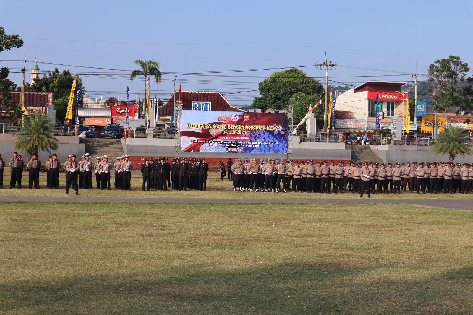 Majalengka, – Upacara Peringatan Hari Bhayangkara ke-78 Tahun 2024 dengan mengusung tema “Polri Presisi Mendukung Percepatan Transformasi Ekonomi Yang Inklusif dan Berkelanjutan Menuju Indonesia Emas” berlangsung khidmat di Lapangan GGM Kabupaten Majalengka. Kapolres Majalengka, AKBP Indra Novianto, S.I.K., M.H., M.Si., CPHR memimpin jalannya upacara tersebut pada Senin (1/7/2024).