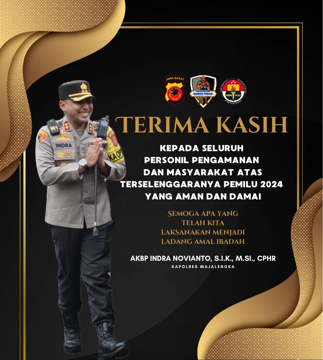 Majalengka, – Kapolres Majalengka, AKBP Indra Novianto, S.I.K., M.Si., CPHR., mengucapkan terima kasih kepada seluruh personil pengamanan dan masyarakat Kabupaten Majalengka atas terselenggaranya Pemilihan Legislatif (Pileg) dan Pemilihan Presiden (Pilpres) 2024 yang aman dan damai. Ucapan terima kasih ini disampaikan pada Jumat (16/2/2024) sebagai bentuk apresiasi terhadap kerja keras dan kerjasama semua pihak.