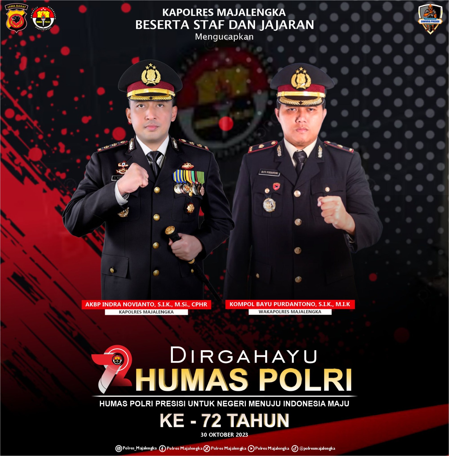 Kapolres Majalengka, AKBP Indra Novianto, menyampaikan ucapan selamat kepada Divisi Humas Polri dan mengakui dedikasi mereka dalam menjaga hubungan yang baik antara Polri dan masyarakat. “Selamat ulang tahun Divisi Humas Polri yang ke-72. Tema ‘Humas Polri Presisi Untuk Negeri Menuju Indonesia Maju’ sangat relevan dengan upaya kita untuk membangun Indonesia yang lebih maju dan berkembang,” ujarnya.